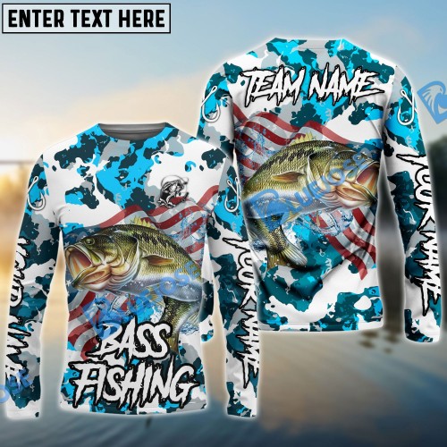 Bluejose Bass Fishing American Flag Red Blue Seawave Custom Name & Team Name Shirts For Kids