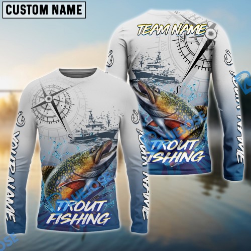 Bluejose Trout Fishing Realistic Fish Compass Anchor Pattern Custom Name & Team Name 3D Shirts