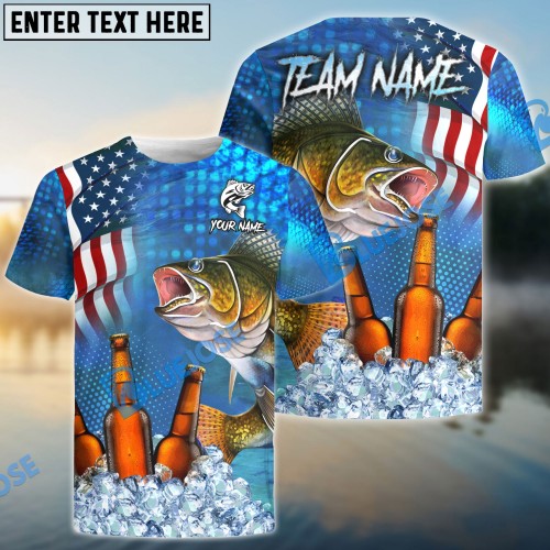 Bluejose Walleye Fishing Beer Bottles & American Flag Design Custom Name & Team Name 3D Shirts