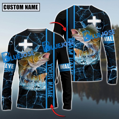 Bluejose Walleye Fishing Blue Cross Pattern Sun Protection Custom Name & Team Name 3D Shirts