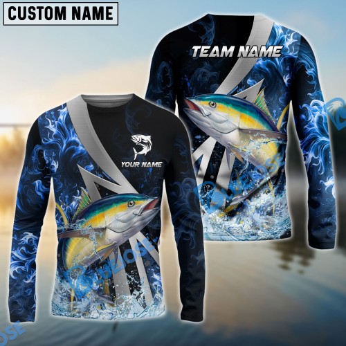 Bluejose Tuna Fishing Blue Flame Smoke Line Premium Style Sport Custom Name & Team Name 3D Shirts