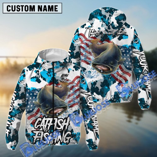 Bluejose Catfish Fishing American Flag Vintage Splash Art Custom Name & Team Name 3D Shirts