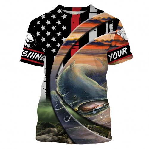 Bluejose Catfish Fishing American Flag Vintage Splash Art Custom Name & Team Name 3D Shirts