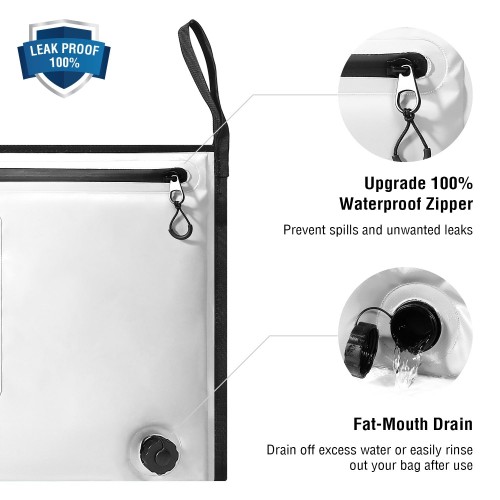 Screw-on drain plug prevents spills, and 22oz heavy-duty polyester lining rinses clean in seconds.