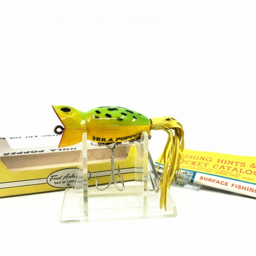Arbogast Hula Popper 750, #07 Frog/Yellow Belly Color with Box. Great vintage bug-eyed model with a side stencil. Main body is about 2 1/4″ long. Vintage popper is in new condition. Box has some minor wear as well. Fish or collect. See photos.