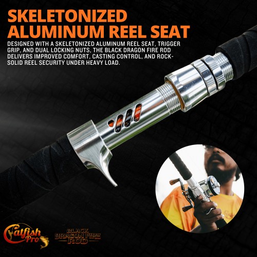 - Reel Seat: Heavy-Duty Skeletonized Aluminum Reel Seat with Trigger Finger for extra grip for longer, better casts.