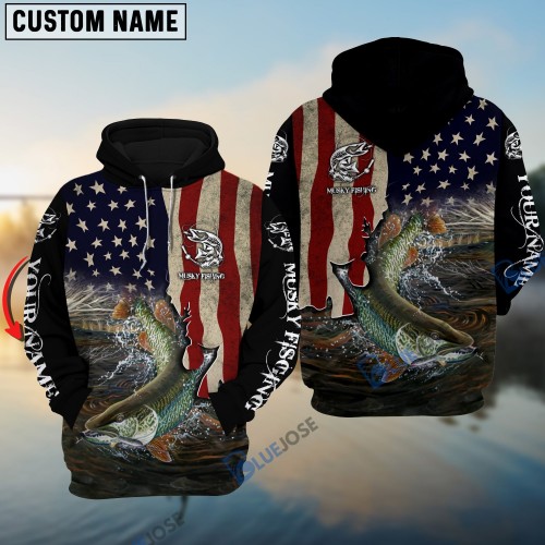 Bluejose Musky Fishing 3D American Flag Patriotic Customize Name 3D Shirts
