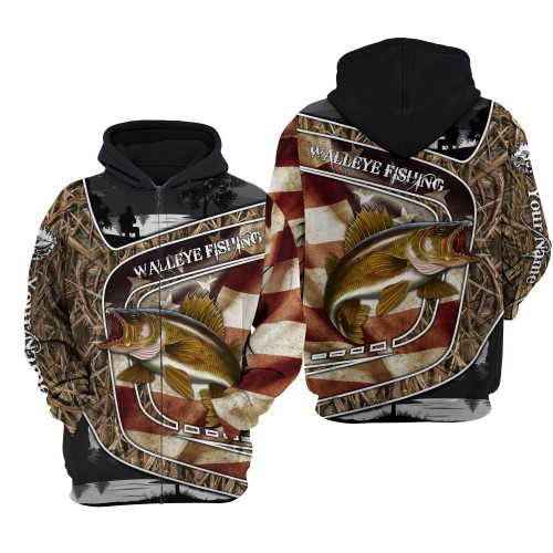 Bluejose Walleye Fishing Camo American Flag Patriotic Customize Name 3D Shirts