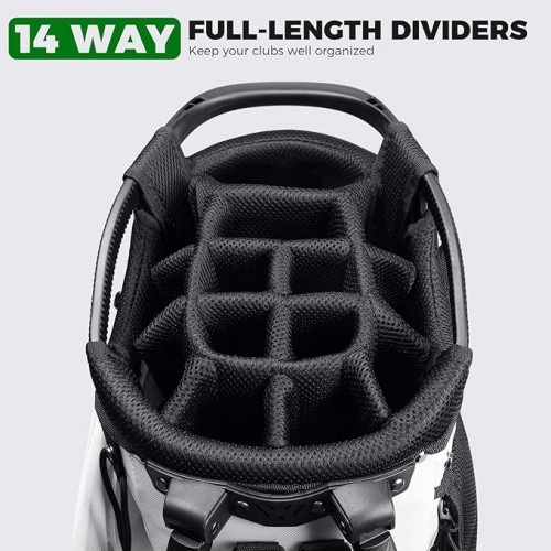 - 【Golf Stand Bag 14 Way Divider】14 separate compartments to keep every club safe and organized. This golf stand bag features an innovative design that secures each club in its individual compartment, preventing scratches and damage caused by club contact.