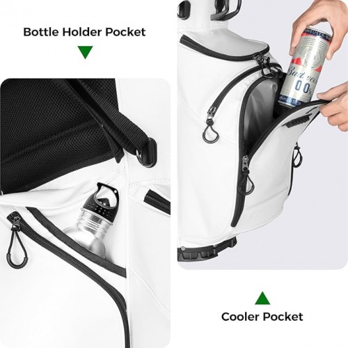 - 【Multi-function Pockets】8 pockets on the golf bag stand provide ample storage space for golf balls, accessories, rain gear, food, or mobile phones and watches. Two dedicated cooler pockets have enough space to store cold drinks, so you can enjoy refreshing. The golf bag is equipped withVelcro glove sticking area, and towel loop.