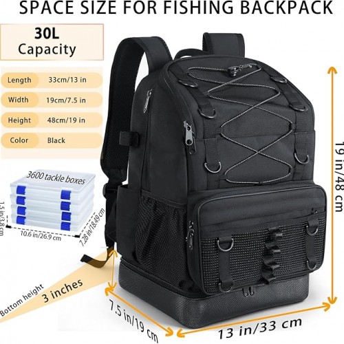 - 【FISHING BACKPCK FOR SIZE】 : Lightweight fishing backpack size for 13″L x 7.5″W x 19″H (33 x 19 x 48cm). with 3 inch height cooler bag for bottom. Fishing rod backpack all of capacity: 30L; Backpack for fishing weight: 2.4LB/39OZ. Fishing bag backpack is designed with a large main compartment with a movable padded divider, can from 1 large space to 2 separate compartments (middle can holds 4 3600-size tackle trays) to maximize fishing storage bag efficiency