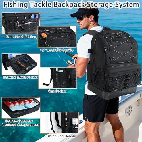 - 【LIGHTWEIGHT & DURABLE WATER-RESISTANT FABRIC】: Fishing tackle backpack is made from easy to clean and tear resistant 1000D nylon fabric for added waterproof. Backpack fishing bags insulated cooler pocket for bottom made of abrasion-resistant & waterproof leather material and with 4 rubber non-slip foot pads on the bottom keep your bag in place – Tackle box backpack keeps bag and lures dry when kayak or boat splashes hit – Built to withstand tough fishing environment