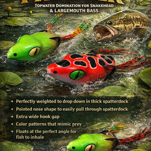 Hook gap that other frogs are jealous of. 5 Natural color patterns to choose from. Welded stainless ring provides added action. This frog will get smashed by any fish wanting to eat topwater.