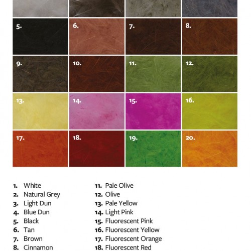 | Color | White, Brown Olive, Pale Yellow, Olive, Light Dun, Natural, Pale Olive, Rusty Brown, Cinammon, Fluorescent Pink, Light Pink, Fluorescent Yellow, Black, Tan, Brown, Fluorescent Orange, Blue Dun, Fluorescent Sunburst, Fluorescent Chartreuse |