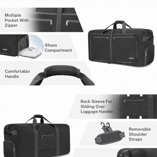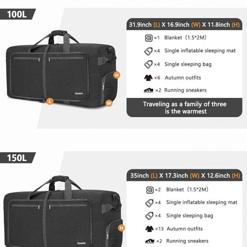 - Reasonal design:This duffel features an internal end pouch, shoe compartment, multiple pockets, adjustable/removable shoulder strap, and a back sleeve for sliding over luggage handles. The 100L and 150L sizes include two side handles, allowing two people to carry it together for a better experience