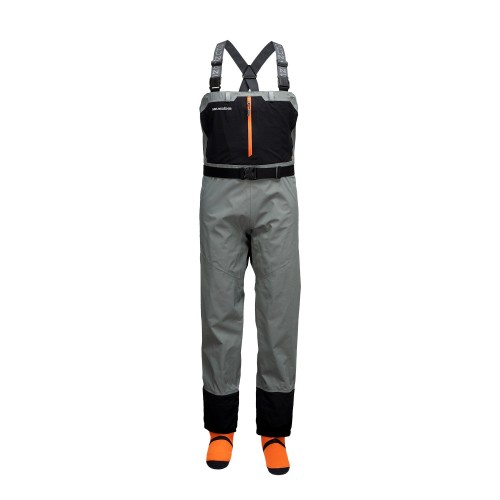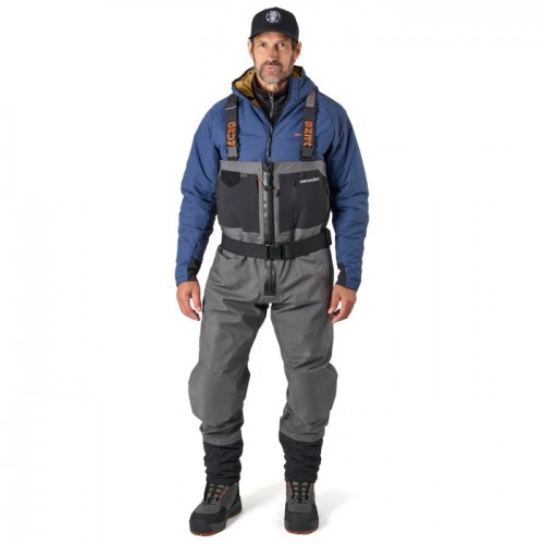 Building on the legacy of ruggedness and durability in our best-in-class Vector Wader, the Vector Zip Stockingfoot Wader enhances your in-water fishing experience with a fully submersible zipper entry wading system and patent pending fishing features. Continuing with our industry-best ultra-dense microfiber 4-layer waterproof/breathable shell, our Vector Wading Collection delivers premium abrasion and puncture resistance with an outstanding 30K+ waterproof rating so that you can fish harder and adventure further both in and out of water. Like all Grundéns waders, our proprietary wading mobility patterning provides ease of movement when navigating your river of choice, plus the addition of molded-in knee pads and abrasion resistant stretch gravel guards enhance the rugged durability of this wader. Our patent pending HAULER™ POCKET is a water-resistant rear pocket system that allows for full 360° storage of fly boxes, personal gear, and of course, a couple beers to quench your thirst on the river. Additional fishing-focused pocket features like welded tippet pockets with laser cut holes allow you to easily rig up on a moment’s notice. Complete with anatomically shaped, size specific, warming neoprene stockingfeet, the Vector Zip Stockingfoot Wader offers an incredible wading experience whether you’re a 200+ day a year fishing guide or a passionate angler looking to upgrade your wading package with a rugged, durable wader.