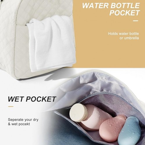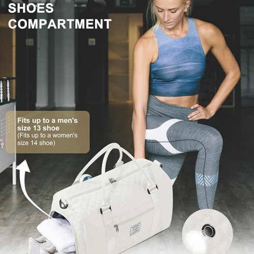 - Dry/Wet Separated & Separate Shoe Compartment: This women’s workout bag comes with a separate wet pocket, high-density waterproof material can help you separate wet and dry items, perfect for storing wet clothes, towels, umbrellas, toiletries and cold drinks, keep your sport bag organized and clean. The sports gym bag comes with a zippered shoe compartment that fits most shoe sizes to keep sweaty clothes or shoes away from the rest of your gear and vents to keep the bag ventilated and eliminate odors. A water bottle fits on the other side of the pocket to keep you hydrated after exercise