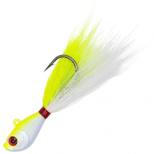 The latest in jig technology, Hurricane 3D Eye Bucktails offer an added attraction that no large predator can resist a live panicking 3-D eye. All feature a generous amount of hand-tied bucktail with rock-hard, epoxy-coated threads. The prism body produces added flash. These jigs are made to withstand the most serious abuse from the strongest, toothiest species. All bucktails are outfitted with black nickel, super-sharp. super-strong hooks for positive sets and holds.
