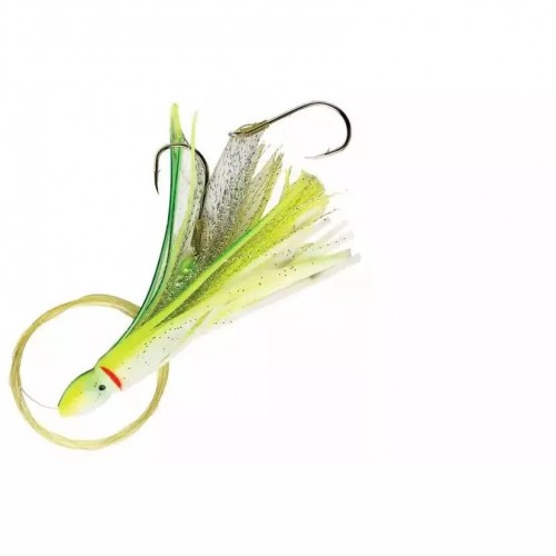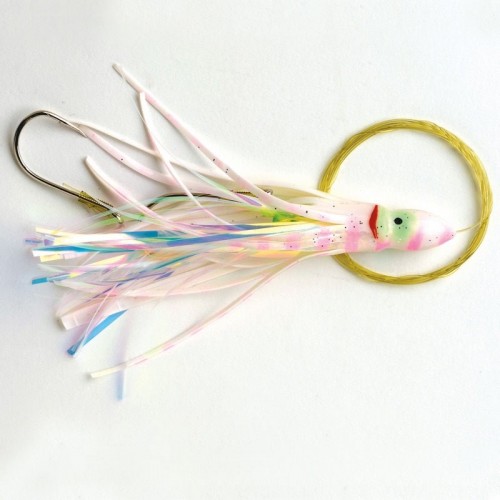 The P-Line Rigged Squid with Tinsel Insert is one tough rig! A P-Line rigged skirt is tied on 60″ of 30-lb. CXX X-tra Strong line is one of the toughest fishing lines out there. A 4-1/2″ UV-enhanced Sunrise Squid is then coupled with a Tinsel Insert. 6mm beads are then used as a spacer to two 5/0 hooks. Ideal for King and Coho, these rigged skirts are most effective when fished a short distance behind a flasher.