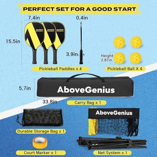 - 【Complete Pickleball Set】This pickleball set includes of 4 long-lasting pickleball paddles, 4 pickleballs, 1 portable outdoor net(17 FT), 1 pole system, 1 pickleball storage bag, 1 convenient carry bag, and 1 court markers. Everything you need to enjoy the indoor /outdoor pickleball game is included in this pickleball starter set