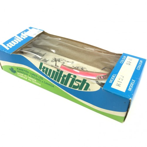 Pre Luhr-Jensen Kwikfish Jointed K12J SPR Sp Red Fluorescent Stripes Color New in Box Old Stock. Great lure here. Pre Luhr-Jensen and Pre Rapala. The K12J is listed as 6 1/4″ long and weighing 16 grams. New old stock here. Box in nice shape, lure new in box, see photos. Awesome lure for fishing, especially muskies, big pike, bass and walleye and very tough to find. Grab this one while you can. Collect or fish.