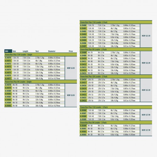 Powerflex Plus Trout Leaders are the strongest trout leaders ever made, with tensile strengths up to 20% more than regular leaders. A technical modification of the nylon copolymer formulation has resulted in prodigious strength increase, without compromising the knot strength or suppleness. Simply put, these are the strongest, most reliable trout leaders ever made.