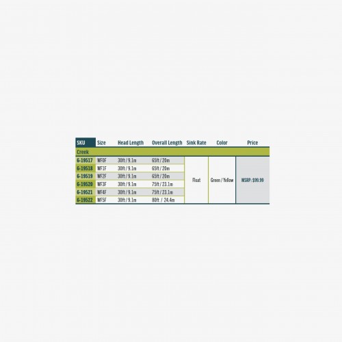 RIO’s Creek line has been designed for anglers that fish small creeks and streams. The line loads at close range, allowing anglers to make short casts of 10 to 15 feet with ease, yet has enough body and head length for those occasions when a longer cast is needed. Each line is built on a supple coldwater core for tangle-free performance, and features SlickCast—the slickest, most durable coating on the market. In addition, the line features MaxFloat Tip Technology, RIO’s proprietary tip coating formula that floats more than twice as high as regular line tips, without any increase in diameter.