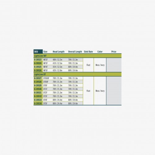| WF Line Size | 30ft Head Weight | Total Head Weight | Head Length | Total Length | SKU |