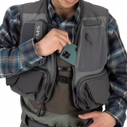 - Updated pocket array includes compression molded fly box storage pocket and easy access chest pocket keeps your phone secure