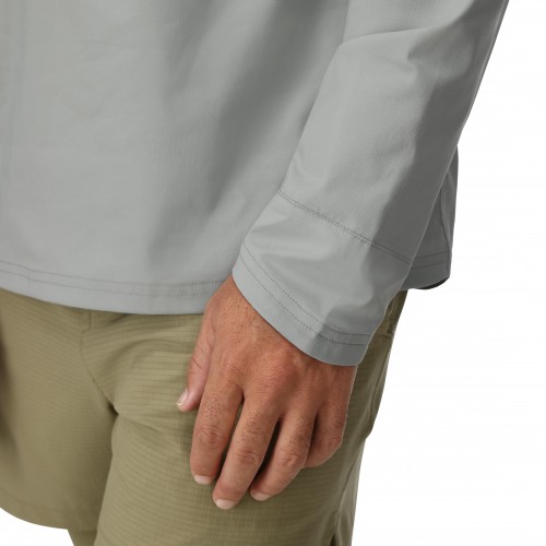 - A combination of woven fabric for durability and knit fabric on the underarms and gaiter for breathability