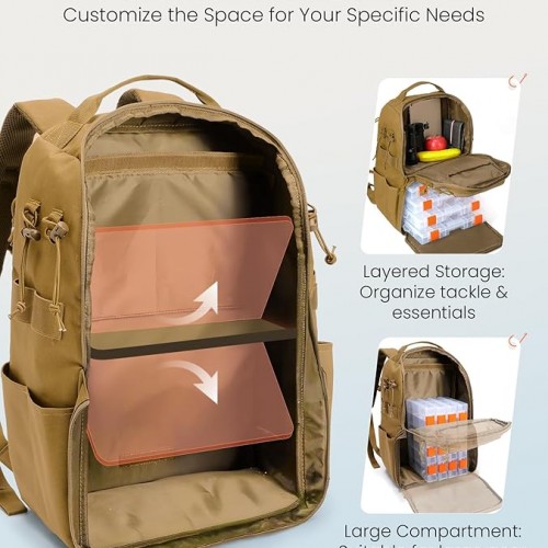 - FLEXIBLE MAIN COMPARTMENT: The main compartment features a foldable divider, creating two independent layers—the upper layer is ideal for storing clothing and snacks, while the lower layer easily accommodates four 3600-size tackle boxes (tackle boxes not included). Lower the divider to create a larger space for storing additional bait boxes or bulky items. Adjust the layout based on your needs, offering versatile and practical storage