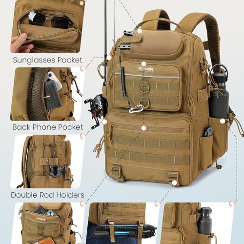 - WELL ORGANIZED COMPARTMENTS: Besides the large main compartment, the fly fishing backpack with 2 rod holder includes a dedicated sunglasses pocket, two small-item storage pouches, and a back panel compartment for essentials. The side elastic pocket fits a 700ml water bottle. Equipped with MOLLE webbing and four external attachment points, it efficiently organizes fishing rods, sunglasses, pliers, tackle boxes, tools, and other fishing necessities—allowing you to carry everything in one bag