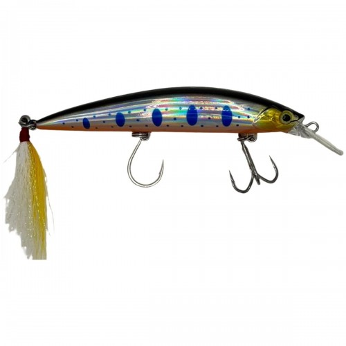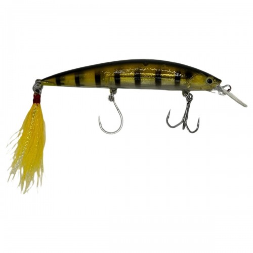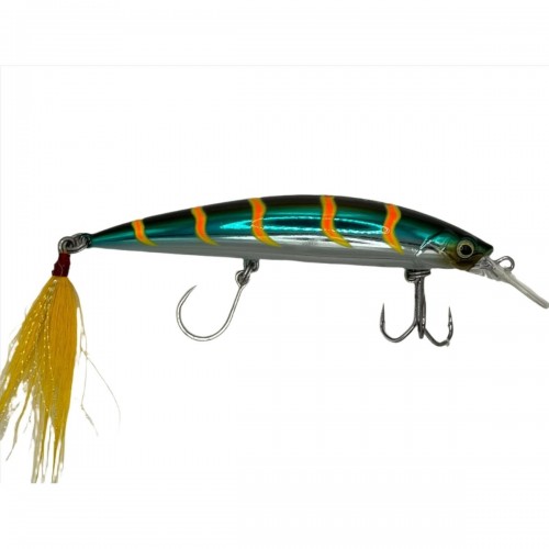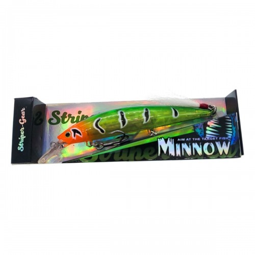 Our minnow SGL-102 is 4.33” and weighs 1.38 oz. Through wire construction with a Mustad 4x belly treble hook and a flag tail for easy catch and release. The single hook is reversed for better swimming action and to eliminate hooking the gills of smaller fish! Sinking to 10 feet with its amazing weight it will out cast the SP Minnow with ease. With its 3D eyes and luminous body this affordable lure deserves a place in your tackle box!