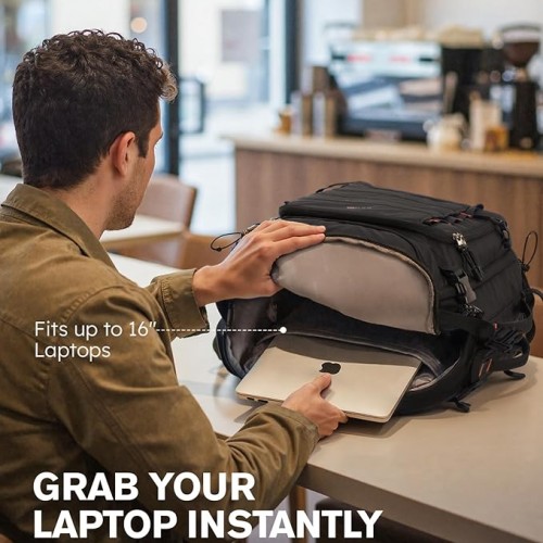 - 【Quick-Access Laptop Compartment with Lockable Zippers】Keep your laptop safe yet easy to reach. The padded section at the bottom of the main compartment balances weight and holds laptops up to 15.6″, cushioned with soft foam for shock absorption. The top double zipper with lock holes allows secure, fast access to your laptop or main items, ideal for commuters, digital nomads, and frequent flyers seeking a reliable carry on backpack for travel