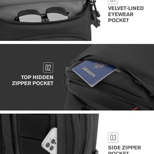 - 【Multiple Small Item Pockets for Everyday Essentials】All your essentials have a place and easy to reach. A velvet-lined eyewear pocket protects glasses, top hidden zipper pockets store passports or IDs, and side zipper pockets with a key leash hold phones, cables, or power banks. Multiple inner mesh pockets keep smaller items visible and tidy. Every pocket has a purpose, making this travel backpack ideal for daily commutes, business trips, and weekend getaways