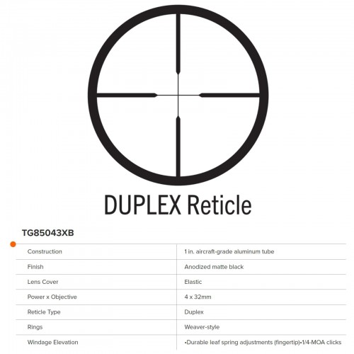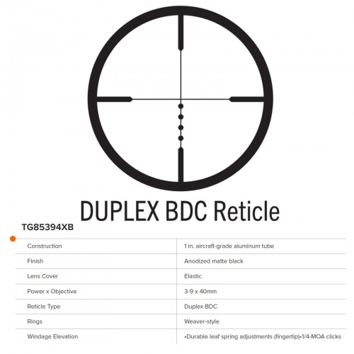 Fully-Coated Lenses Provide Maximum Brightness, Clarity, And Contrast; Bdc Dot Reticle For Long Range Holdover (3-9X Models), Rubber-Coated, Speed-Focus Eye Piece, Durable, Scratch-Resistant, Non-Reflective Matte Finish, Scope Is Water Resistant, Fogproof, And Nitrogen Gas-Filled; 1-Inch Aircraft-Grade Aluminum Tube, Weaver-Style Rings Included