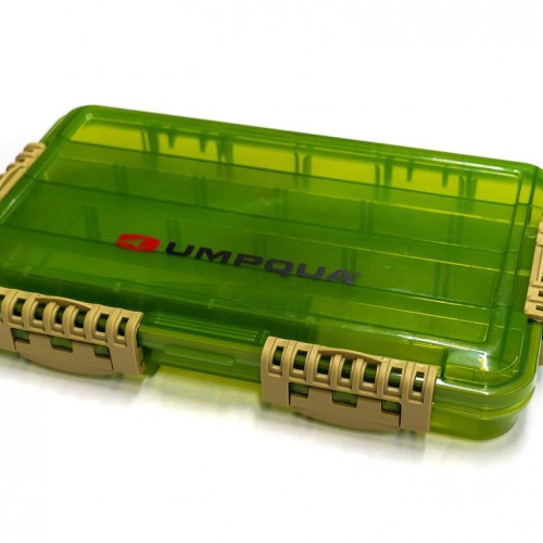 LARGE 17 COMPARTMENT ADJUSTABLE FLY BOX – Waterproof compartment boxes are a necessity for the boat angler and this Large box offers up secure storage for your fly investment. Made to slide in perfectly to boat bags so you can keep your confidence flies organized and at the ready. These Waterproof Bug Lockers are fully adjustable to fit everything from musky flies, to steelhead intruders, hold a horde of hoppers, or work as a saltwater fly shack. These are durable and shatterproof and feature a 3-D molded high-grip FlyTrap closure system. Dimensions – 14″ x 8.5″x 2″. COLORS: (1)Aqua, (2)Olive.