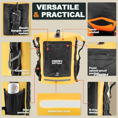 - 💧 𝐇𝐄𝐀𝐕𝐘-𝐃𝐔𝐓𝐘 𝐖𝐀𝐓𝐄𝐑𝐏𝐑𝐎𝐎𝐅 𝐏𝐑𝐎𝐓𝐄𝐂𝐓𝐈𝐎𝐍 – Built for extreme conditions, this backpack features 500D PVC material with high-frequency welded seams and a reliable roll-top closure to keep your gear dry in rain, river crossings, or water sports.