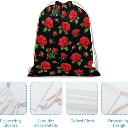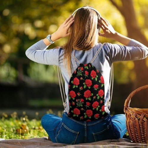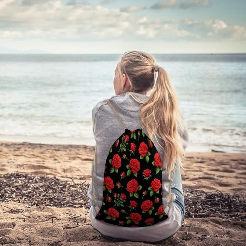 Workout Drawstring Tote Bag, Lightweight Sport Drawstring Backpack, Red Rose Flowers Floral Black Storage Bags for Travel Gym Workout